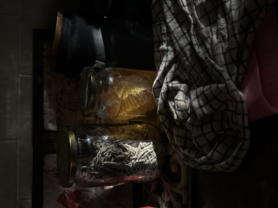 Two glass jars with gold lids sit horizontally. The top jar contains amber-colored honey with visible honeycomb patterns. The bottom jar holds grey, dried herbs. A grey and white checkered cloth is draped beside the jars. The scene is darkly lit, creating strong shadows that obscure details in the background. Hints of red and patterned paper are visible near the jars.
