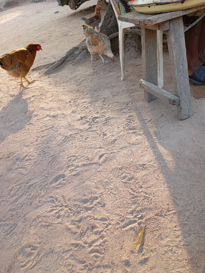 - "Three chickens forage on sandy ground under a table" by FM-nR6KD3, licensed under CC BY 4.0