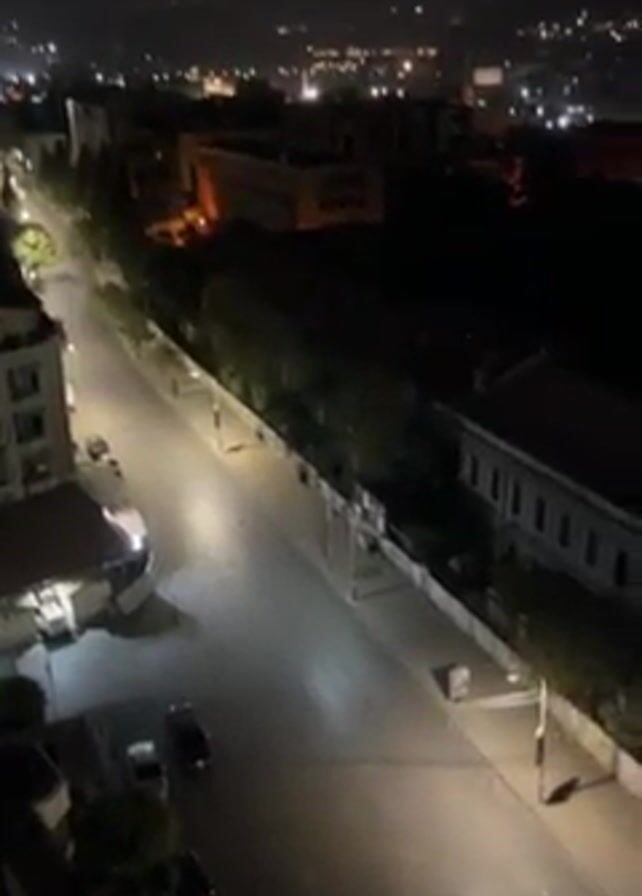 night-time view of a city street from an elevated position, possibly a building. The street is largely empty, lit by streetlights which cast long shadows. Several buildings of varying sizes and shapes line the street, and trees are visible along the sidewalk. The city skyline is faintly visible in the distance, dotted with lights. In the foreground, parked cars are visible. Debris lit by streetlights are observed on the street. The camera appears to move slightly, panning across the scene.