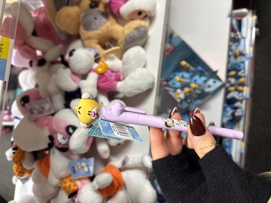 A person holds a light purple pen with cartoon characters printed on its side. A yellow cartoon chick adorns the pen's top. The pen has a price tag attached. Stuffed animals crowd the background, creating a soft, colorful blur. A display of items with underwater themes is visible in the background. The person wears a black sleeve.