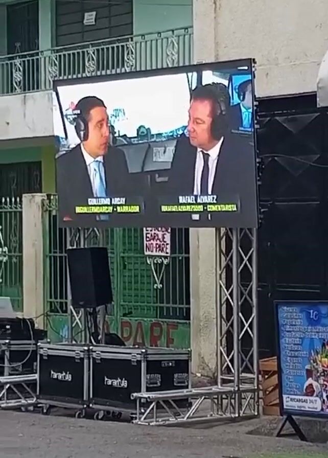 street scene with people gathered on a sidewalk and a large screen displaying a news or commentary program. The screen is set up on a metal frame with sound equipment below. It displays two men in suits, Guillermo Arcay and Rafael Alvarez, likely news anchors or commentators. The audio indicates they are having a conversation, mentioning work and giving arms a rest. On the sidewalk, a group of people are sitting and standing, some talking to each other. A woman in a blue shirt appears to be interacting with them. The street has a car and a motorbike passing by. There are buildings on both sides of the street, and the overall atmosphere seems like a community gathering to watch the broadcast.
