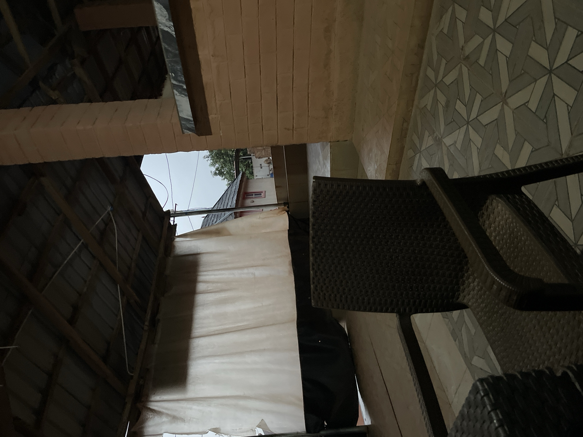 A medium shot shows an outdoor scene in Jos, Nigeria. A brown wicker chair sits on a tile-patterned floor, against a beige brick wall. A tattered white cloth partially obscures a dark, wooden, slat-roofed structure. Visible through a gap is a glimpse of a distant house under a cloudy sky.