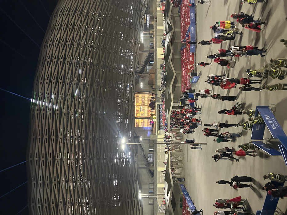 The image depicts a large crowd gathered outside a stadium at night. People wearing red and black clothing are visible. The stadium has a unique, geometric design with numerous triangular patterns. A large screen displays the number "04". The area is well-lit with overhead lights illuminating the crowd and the stadium's exterior. Some barriers are present, likely for crowd control.