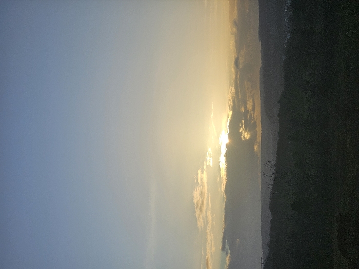 A serene landscape displays a gradient sky transitioning from a clear blue to a warm, sunlit yellow. The sun, partially obscured by clouds, casts a radiant glow. Dark green land stretches across the lower portion of the image, contrasted against the bright sky. The horizon line is visible, subtly separating the sky from the land.