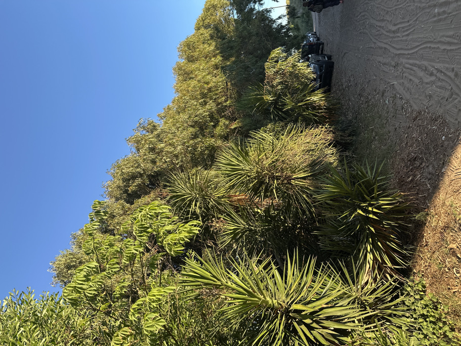 The landscape showcases a vibrant mix of vegetation under a clear blue sky. Sharp, spiky yucca plants dominate the foreground, contrasting with the softer, rounded foliage of various trees. To the right, a dirt road with tire tracks suggests vehicular activity, and parked black off-road vehicles sit further up. The scene captures a sunny day with a blend of natural and human elements.