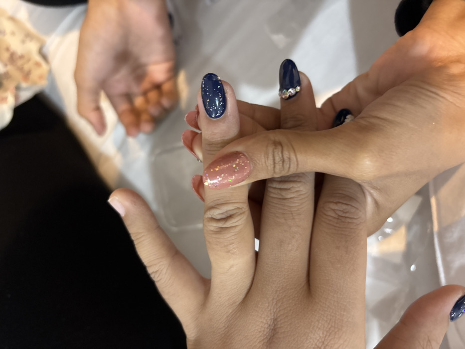 pair of hands. One hand is being manicured, with dark blue nail polish on some nails adorned with small white dots or gems. Another nail is painted a shimmering rose gold. The other hand, presumably belonging to the manicurist, is holding the first hand. The background is a mix of white and dark surfaces.