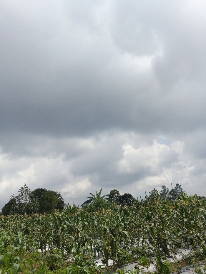 A landscape features a cornfield in the foreground. Rows of cornstalks stand tall against a backdrop of trees and a cloudy sky. The sky is overcast with layers of grey clouds obscuring the sunlight. White plastic mulch covers the ground between the rows of corn, and smaller plants grow in the foreground, adding to the scene's agricultural feel.