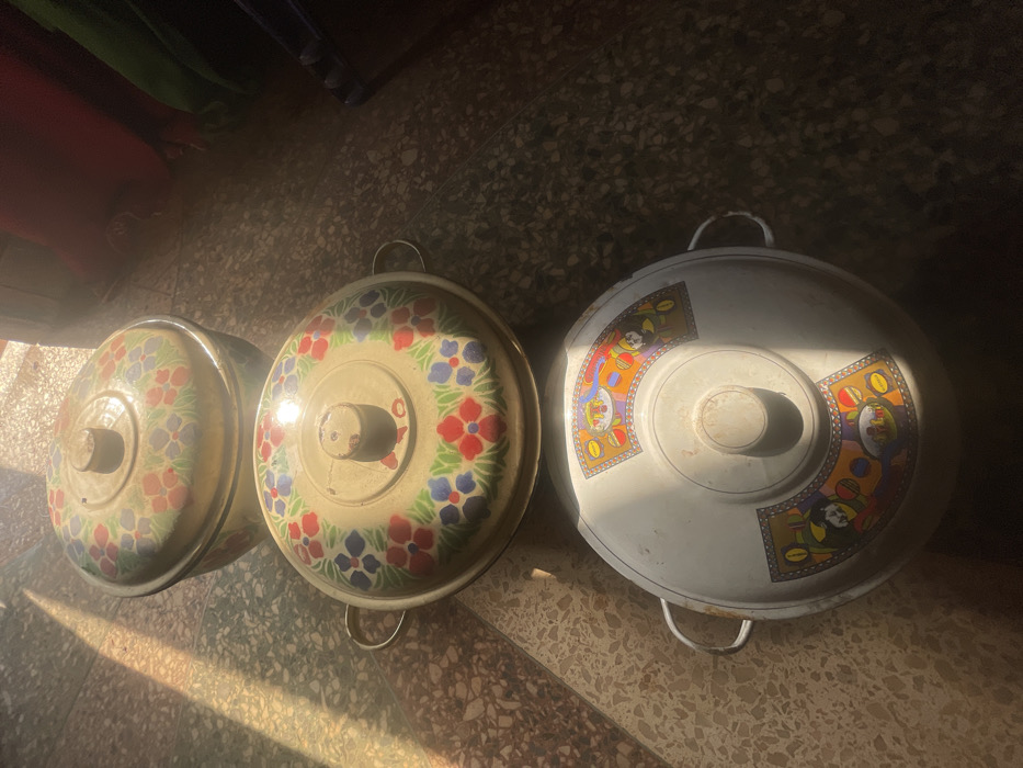 The scene depicts three circular, lidded food warmers or serving dishes arranged diagonally on a tiled floor in Awgbu, Nigeria