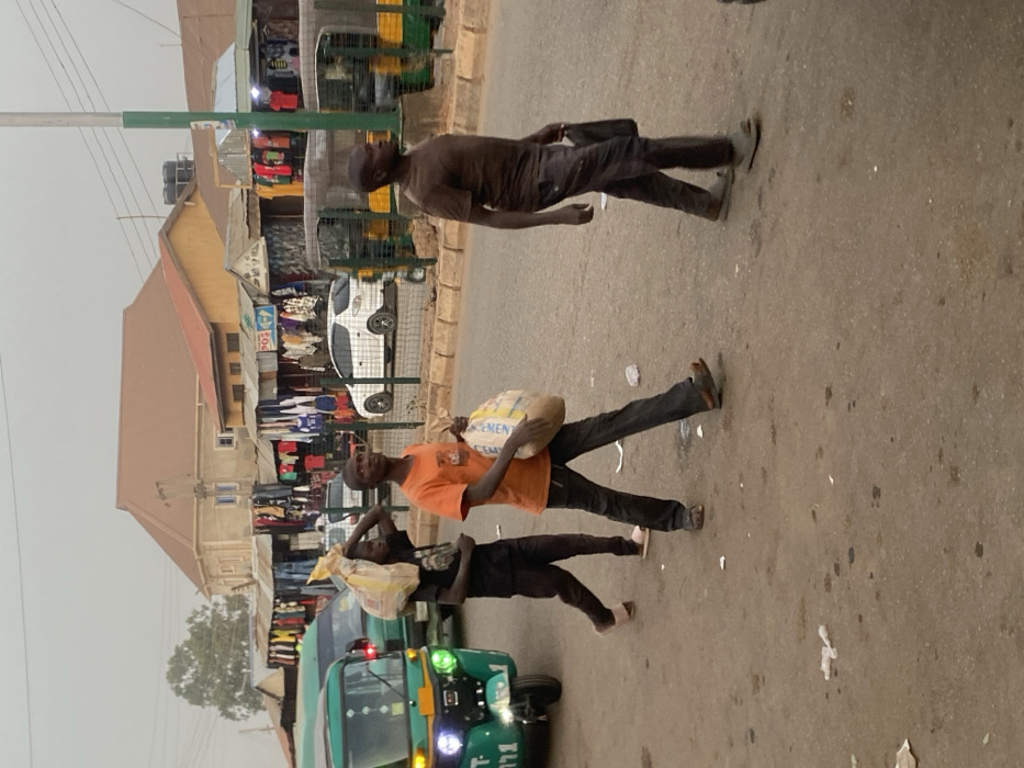 Three individuals navigate a roadside urban environment. Two men are walking in the middle of the road, each carrying items; one is wearing an orange t-shirt and holds a bag labeled “cement,” the other has a bag on his head. A third person stands near shops with clothes hanging outside. A three-wheeled vehicle known as Keke is partially visible in the foreground. Buildings, shops, and cars are present in the background.