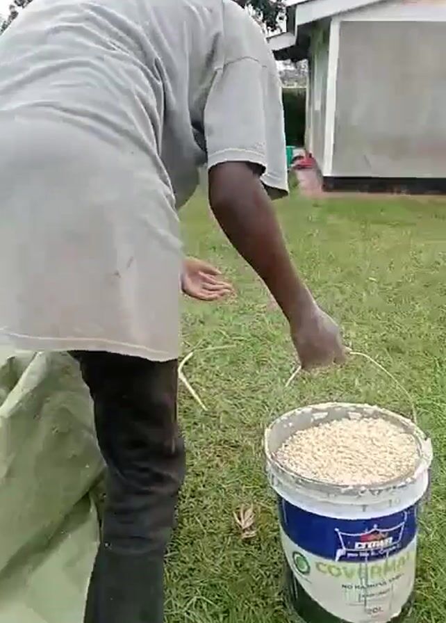 A person wearing a light grey shirt and dark pants is shown in a yard, moving a white bucket filled with light brown pellets. The bucket has a blue and green label that reads “COVERMAT”. The person moves the bucket from the grass to a green tarp filled with the same pellets, presumably pouring them into the tarp. The background consists of a green lawn, a small building, and several trees. A couple of brown sacks are visible in the periphery.