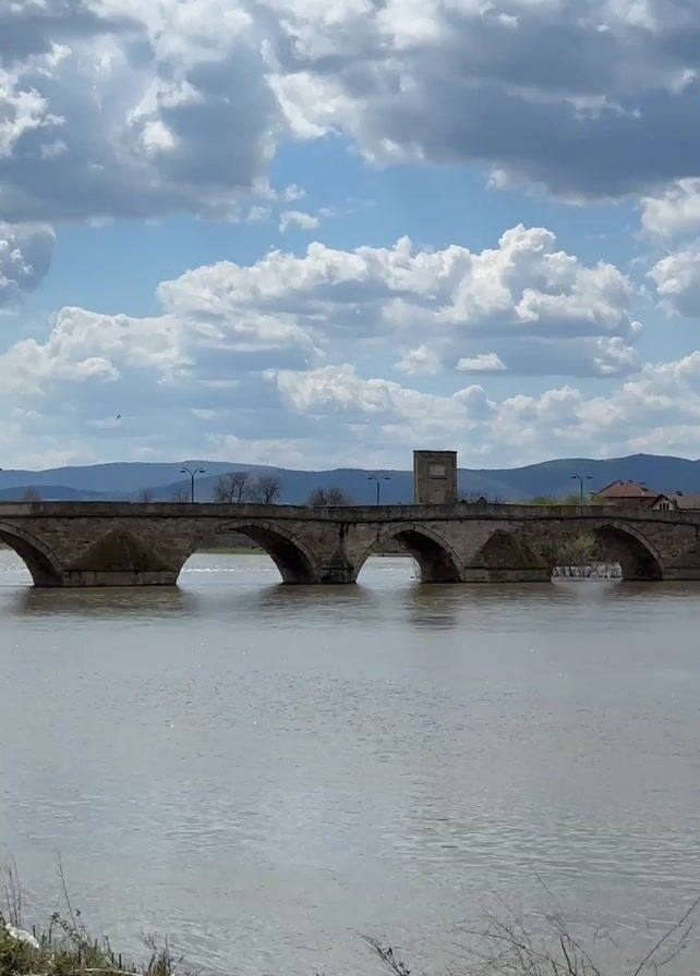 long stone bridge spanning a river, beneath a sky filled with cumulus clouds. The river water is a murky brown color. The bridge is composed of multiple arches and has a square tower-like structure in the middle. On the far side of the river, there are houses and rolling hills in the background. In the foreground, the riverbank is covered with grass and small plants. A bird flies through the sky.
