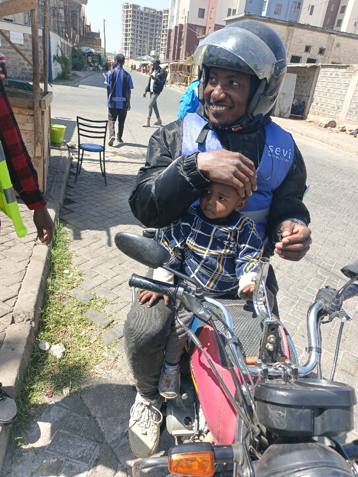 This image captures a daytime urban street scene in Nairobi, Kenya. In the foreground, an adult male, wearing a black motorcycle helmet, a black jacket, and a blue vest with "sevi" branding, is seated on a red and black motorcycle. He is smiling broadly and has his right hand placed on the head of a young child, who is seated in front of him on the motorcycle. The child wears a blue and yellow plaid long-sleeved shirt and has their right hand gripping the motorcycle's handlebar. The child's expression is neutral, looking slightly to the right of the frame. The environment consists of a paved street with interlocking pavers, a concrete curb, a narrow strip of grass, and a paved sidewalk. In the immediate left foreground, a partial view of another person wearing a red plaid shirt and a bright yellow-green vest is visible. Further down the sidewalk, a light green plastic basket rests next to a black metal chair. In the mid-ground, several other individuals are present on the street, including one person in a blue and black striped shirt walking away from the camera. The background reveals a mix of urban architecture: on the left, a building under construction with visible scaffolding, and on the right, multi-story buildings made of light-colored materials. The sky is clear, indicating sunny weather conditions.