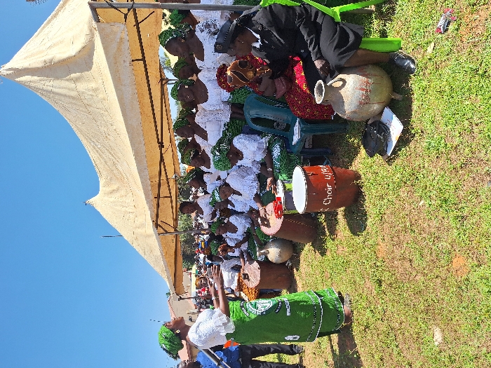 The image portrays an outdoor gathering in Unguwan Rimi, Nigeria, beneath a large, light-colored canopy tent, under a clear blue sky. On the left, a woman stands with her arms outstretched, facing right, attired in a white lace blouse, a long green and white patterned wrapper, and a matching green head tie. Approximately twenty-five women are seated in multiple rows under the tent, dressed uniformly in white lace blouses, green and white patterned wrappers, and matching green head ties. Many of these seated women have open mouths, suggesting vocal performance, and are positioned behind various drums, some appearing to be repurposed barrels with white drumheads. One barrel drum in the foreground is marked "Choir U/R". On the far right, an older woman is seated on a green plastic chair, wearing a black dress and black head covering, observing the activity. A large, weathered clay pot rests on the grass near her. The ground is covered with green grass and some visible soil patches. Additional blurred figures are visible in the background beyond the tent structure.