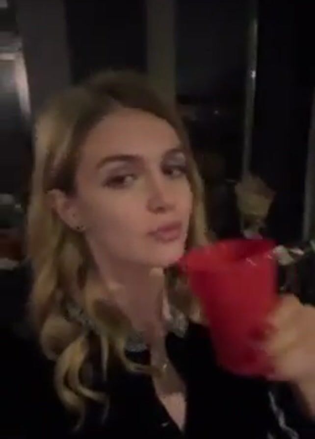 A woman with blonde hair is standing indoors, facing the camera. She is wearing a black shirt or dress with a decorative collar. She raises a red plastic cup to her lips and drinks from it, then lowers the cup and puckers her lips. There is music playing in the background, and other people can be seen in the background.