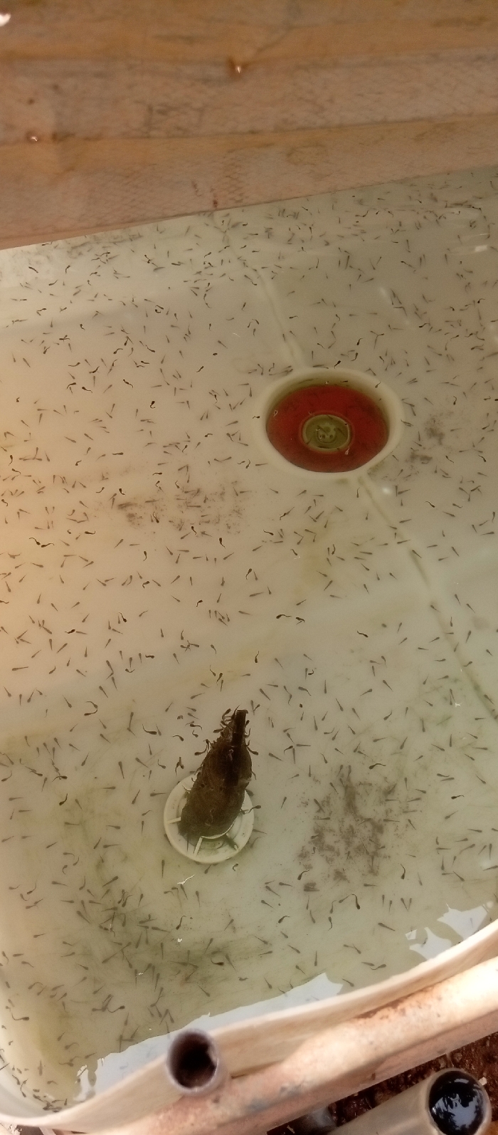 n overhead view of an aquatic tank located in Rido, Nigeria. The tank, rectangular and constructed from a light-colored material, contains clear water. Hundreds of small, dark-colored fish fry are actively swimming throughout the tank. A red circular drain or overflow outlet with a green center is present near the upper right corner. In the lower central portion, a dark, irregular object rests on a white circular base, surrounded by fish fry and some dark sediment. The upper edge of the tank is bordered by a light brown structure. A metallic pipe is visible in the lower right foreground, positioned external to the tank. No human subjects are present.
