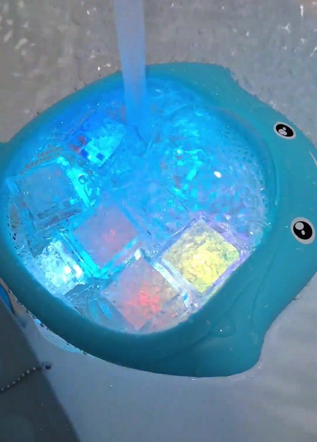 blue, plastic toy shaped like a manta ray in a bathtub. Water flows from the faucet and fills the toy's central area, which contains several clear plastic cubes. The cubes light up with alternating colors, including red, blue, yellow, and green, creating a colorful display within the water. The toy has simple, cartoonish eyes and a smiling mouth. The rest of the bathtub is filled with water, and the faucet remains on throughout the video.