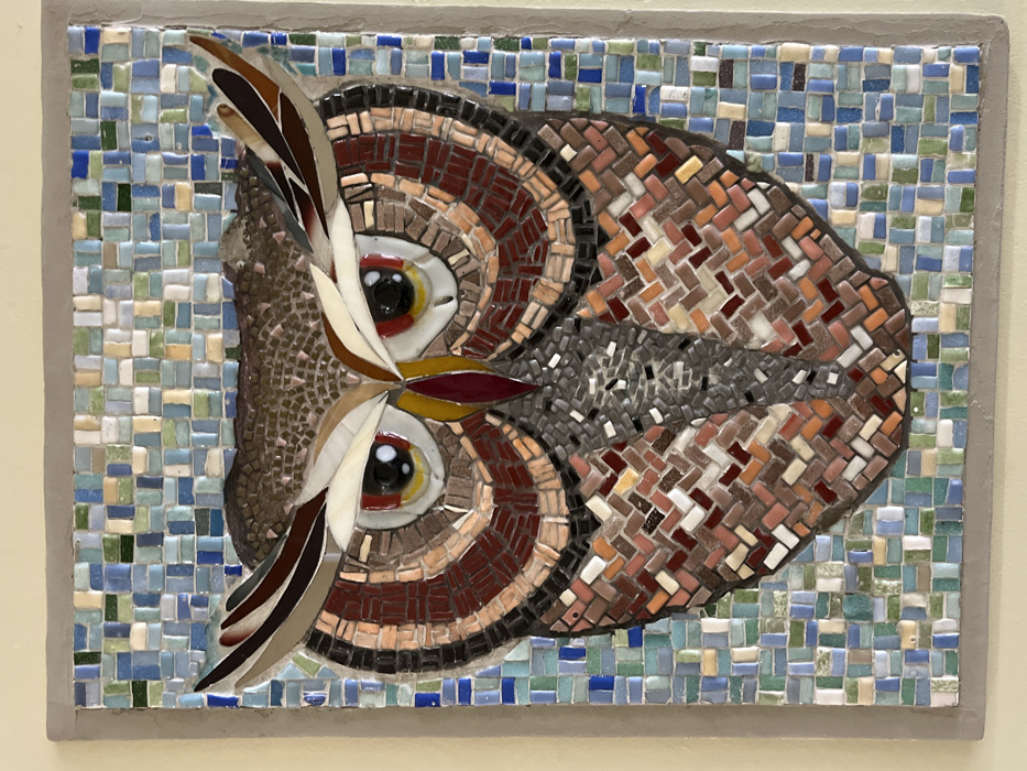 The image displays a detailed mosaic artwork depicting a stylized owl, prominently featured on a wall within Veliko Tarnovo, Bulgaria