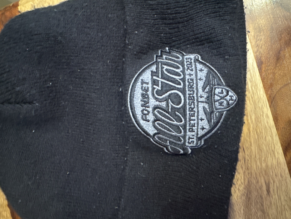 A black knit beanie rests on a wooden surface. The beanie features a prominent circular embroidered logo rendered in light grey and silver threads. The logo design includes the text "FONIBET" at the top, "All-Star" in a stylized script centrally, and "ST. PETERSBURG + 2023" along the lower arc. Below the "All-Star" text, a detailed emblem with wings, stars, and a shield containing the letters "KHL" is visible. The black fabric of the beanie shows minor lint accumulation. The underlying wooden surface displays distinct grain patterns. This scene is situated in Matveevskoe, Russia.
