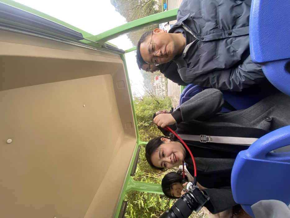 Three people are in a green cart with blue seats. An Asian man wearing glasses and a gray jacket sits in the back. A woman in a gray coat is in the middle, holding a red strap, and smiling. A young girl is in the front, holding a camera with a large lens. Green foliage is visible through the cart's side windows.