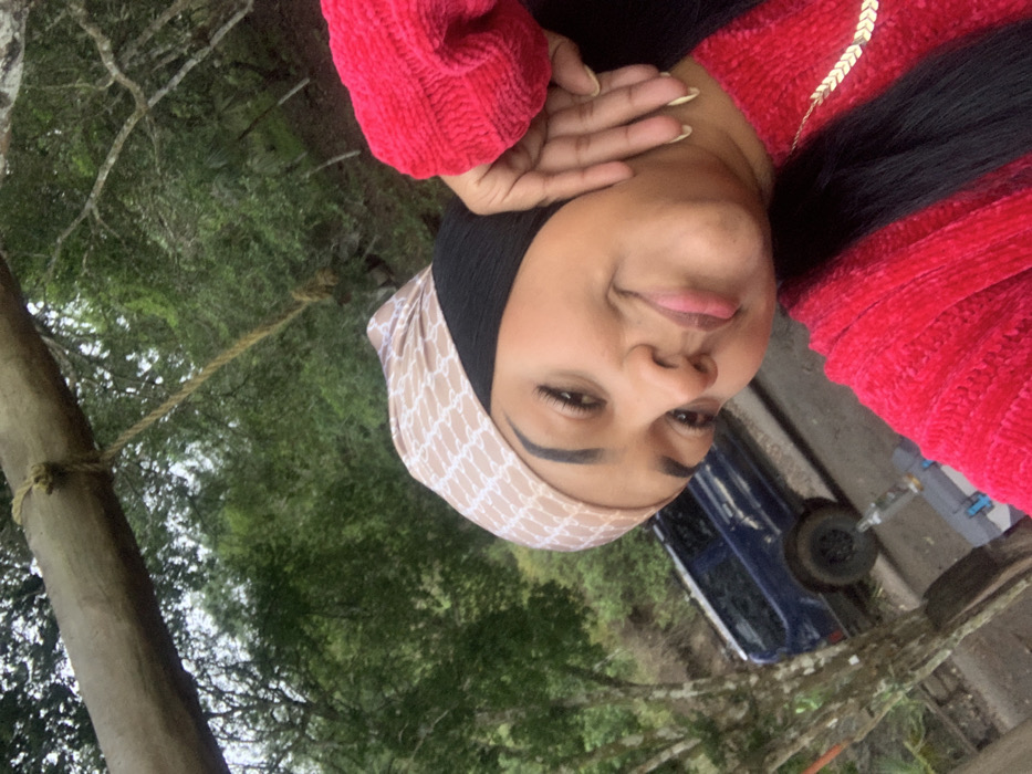A woman is posing outdoors. She is wearing a red sweater, a black under scarf, and a patterned headscarf. She has a gold necklace on. Her hand is near her face. In the background, there are trees and a vehicle. A rope is tied to a tree trunk.