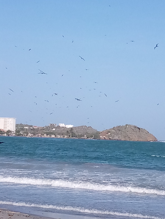 The image displays a clear coastal scene in Porlamar, Venezuela, under a bright, cloudless blue sky. A large flock of dark-colored birds is widely dispersed across the sky, with multiple individuals captured in various stages of flight. The mid-ground is dominated by the ocean, characterized by turbulent, blue-green water and visible waves, some of which feature whitecaps breaking towards the foreground. The background reveals a horizontal coastline composed of hills and rocky outcrops. On the far left of the coastline, a tall, white multi-story building stands prominently amidst smaller structures and sparse green vegetation. Towards the center and right, a distinct, arid-looking rocky hill or small peninsula, sparsely covered with low-lying vegetation, extends into the sea. Additional smaller buildings are visible on the lower slopes of these background hills. The immediate foreground shows a narrow strip of light-colored sandy beach with gentle waves receding. No human figures are visible.