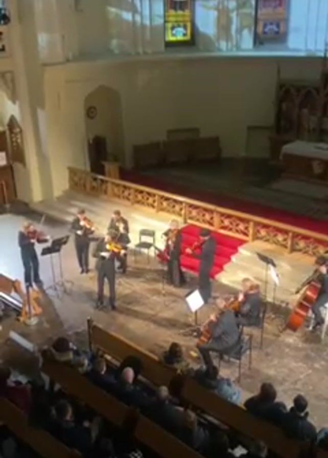 A wide shot shows a string ensemble performing in what appears to be an old church, playing to a seated audience