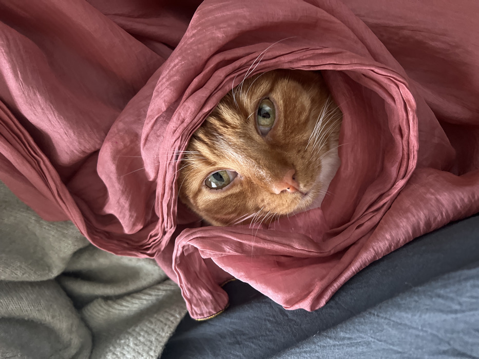 A domestic cat, specifically an orange (ginger) tabby, is depicted in a close-up, portrait-oriented shot. The cat's head and upper chest are visible, nestled within a voluminous mass of salmon-pink, satin-like fabric. The cat's fur is predominantly orange with darker tabby stripes visible on its forehead. Its eyes are open, displaying an olive-green or hazel iris with vertically elliptical pupils. A pink nose pad is visible, along with white fur on its chin and prominent white whiskers extending laterally. The cat's gaze is directed slightly upward and to the viewer's left. The pink fabric, characterized by numerous soft folds and a subtle sheen, engulfs most of the cat's body. In the upper left background, a section of a light grey, coarse-knit textile is visible. Below that, in the lower left quadrant, a dark grey or dark blue plain-weave fabric is partially visible. The scene is consistent with an indoor domestic environment. The image does not contain visual information to determine the specific location within Worthing, United Kingdom.