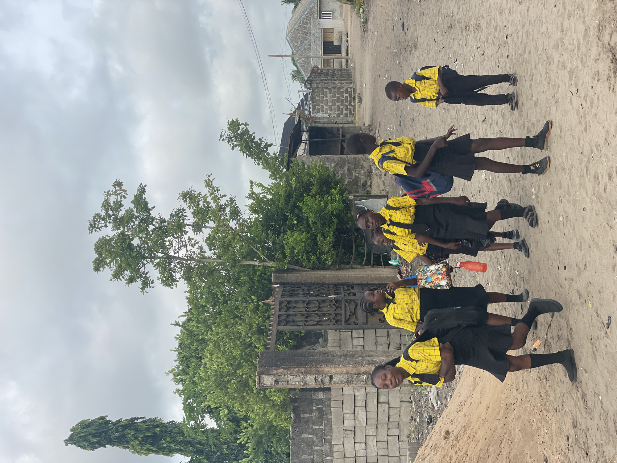 six students in school uniforms, walking along a sandy path in Badagry, Nigeria
