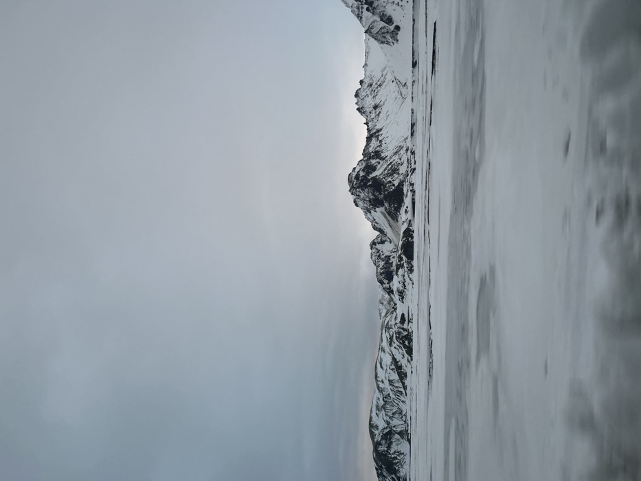 The image depicts a vast, desolate, snow-covered landscape in the city of Unknown, Iceland. The foreground consists of a wide, flat expanse of snow and ice, appearing mostly uniform with subtle variations in texture and some darker, possibly wet or exposed, patches. A dark, irregular horizontal band, likely exposed earth or water, separates this foreground from a distant mountain range. The background features a continuous line of snow-capped mountains with jagged peaks and visible dark rock formations contrasting with the white snow cover. The sky is overcast, dominated by shades of grey, with slightly lighter tones near the horizon. No people, animals, or man-made structures are visible. The scene is illuminated by diffused, ambient light, indicative of an overcast winter day.