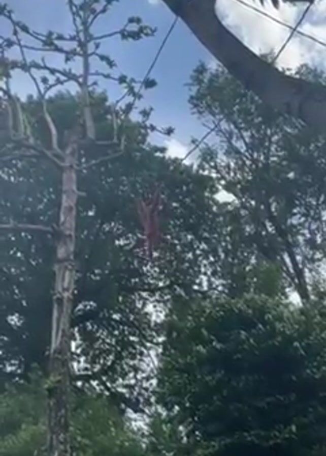 n orangutan hanging by its arms from a wire strung between trees. The orangutan is swinging slightly, and the surrounding trees are lush and green. The sky is visible through the branches and is partly cloudy.