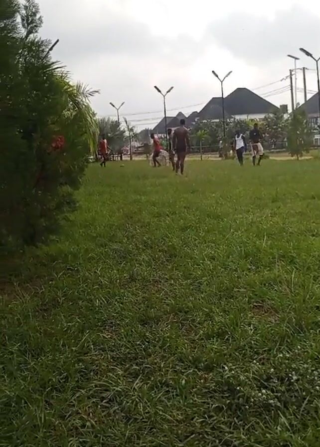Several people are playing soccer on a grass field. The sky is overcast. There are street lamps and houses in the background. A bush is visible in the left foreground.