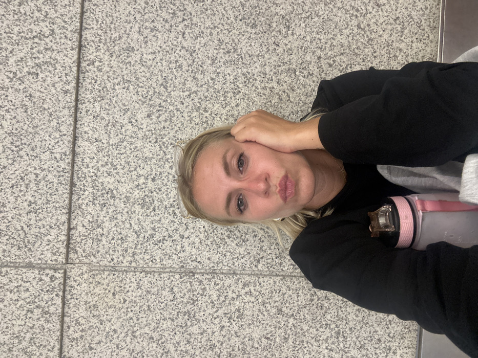 A blonde woman is pictured from a slightly high angle, reclining on a tiled floor. She is wearing a black long-sleeved shirt and holding her face with her right hand. Her lips are pursed in a kiss. A water bottle with a pink lid rests near her arm. The floor consists of speckled light grey tiles with dark grey accents, demarcated by a seam running horizontally across the frame.