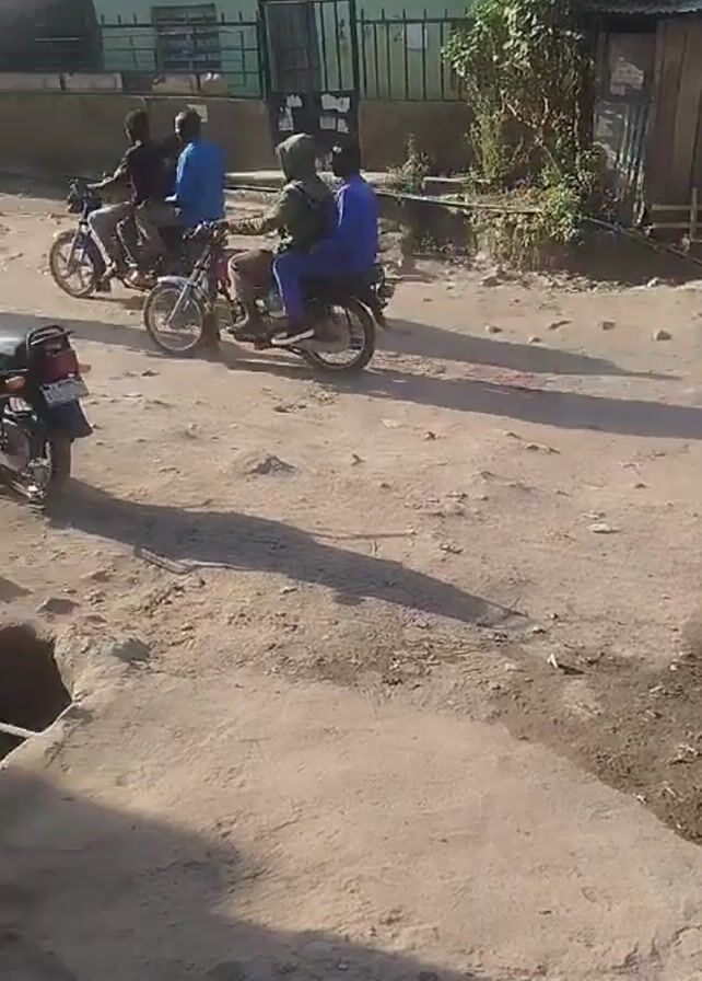 dirt road with several motorcycles riding by. Some of the motorcycles carry multiple passengers. There is a parked motorcycle on the side of the road. Buildings are visible in the background. The area appears to be a residential neighborhood. A trench with debris is visible on the side of the road. The video is taken during the daytime.