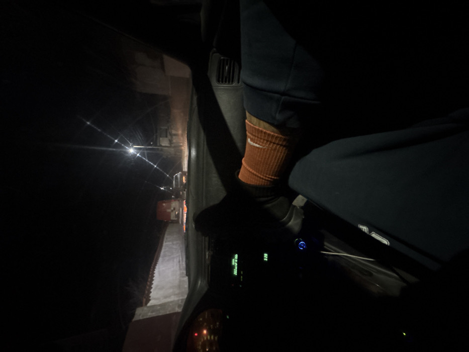 The image presents a nighttime scene in Parvomay, Bulgaria, viewed from inside a vehicle. The foreground shows the interior of the vehicle, specifically a person's leg extended with their foot resting on the dashboard or a similar surface. The person wears dark trousers, an orange ribbed sock with a white Nike logo, and a dark shoe. The left side of the dashboard is partially visible, displaying illuminated instrument cluster elements including a red warning light, green indicators, and a digital display showing "28.0" and "3:28." Below the dashboard, a blue illuminated device, likely a charger, is visible. Outside the vehicle, a dimly lit street is present. On the left, a light-colored wall with a terracotta tile coping runs parallel to the road. Further down the street, a red-orange truck with illuminated rear lights is positioned, followed by a lighter-colored car, also with illuminated lights. A bright streetlamp on the right side of the road provides illumination, causing distinct lens flares in the image. Structures identified as buildings are vaguely discernible in the dark background on both sides of the street. The ground appears unpaved or uneven in certain sections.