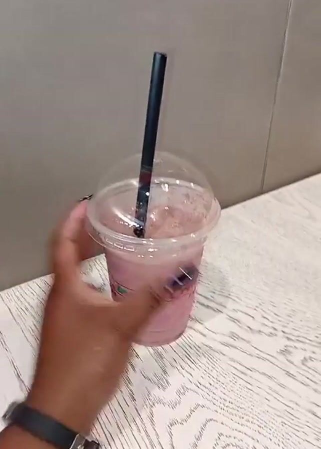 A dark-skinned person holds a plastic cup with a dome lid and a black straw