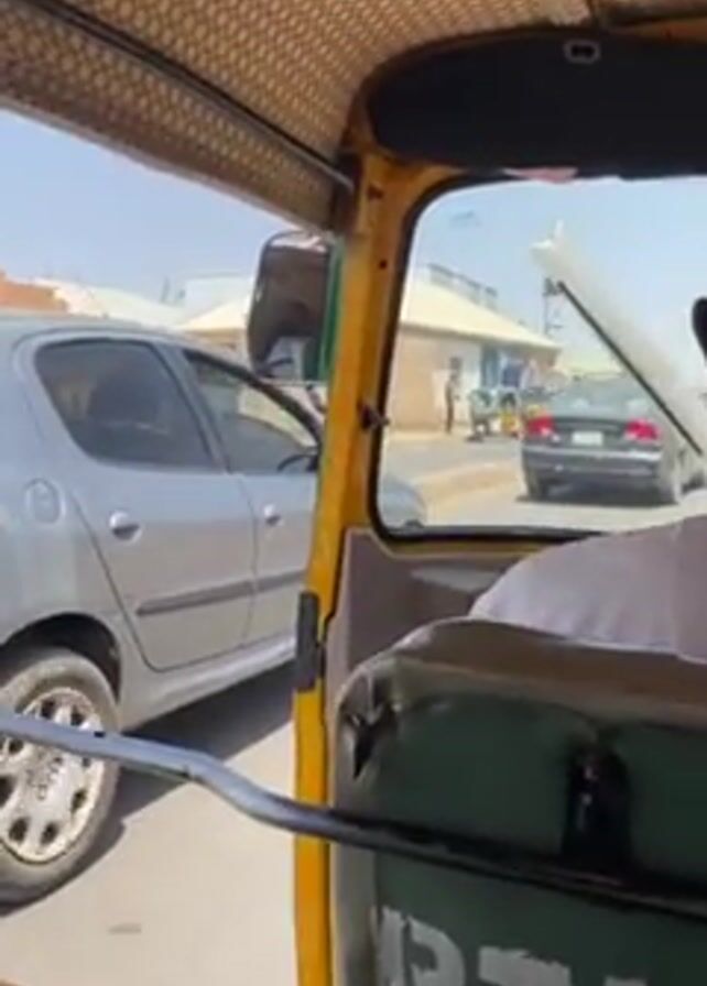 From inside a yellow auto-rickshaw, the video shows a street scene in daylight. Other cars and auto-rickshaws are visible, waiting at an intersection. The auto-rickshaw appears to be stationary. A person is sitting in the driver’s seat but is mostly out of view. Buildings and pedestrians are visible in the background. The overall environment seems urban, and the weather appears clear.