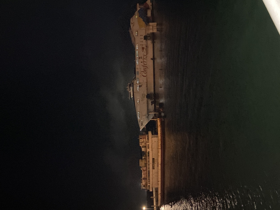 The image depicts a nighttime scene at a port in Punta de Piedras, Venezuela. Two vessels are visible on calm, dark water, illuminated by artificial light sources. On the right, a large, white catamaran-style passenger ferry is docked. It features "Conferry" branding in red text on its side, along with "Builtland Travel" and a stylized Venezuelan flag graphic towards the stern. Lights are visible through some of its windows and on its decks, reflecting on the water below. Its hull shows some staining and wear. To the left, a smaller, older, multi-deck vessel is moored. This vessel is predominantly white with significant rust streaks along its hull, particularly at the waterline and on its superstructure, suggesting a state of disrepair or abandonment. No lights are visible on this vessel. The sky above is dark, indicating night, with some faint clouds present. Artificial lights from the dock or nearby structures cast reflections on the water surface and illuminate the vessels. No individuals are visible in the scene.
