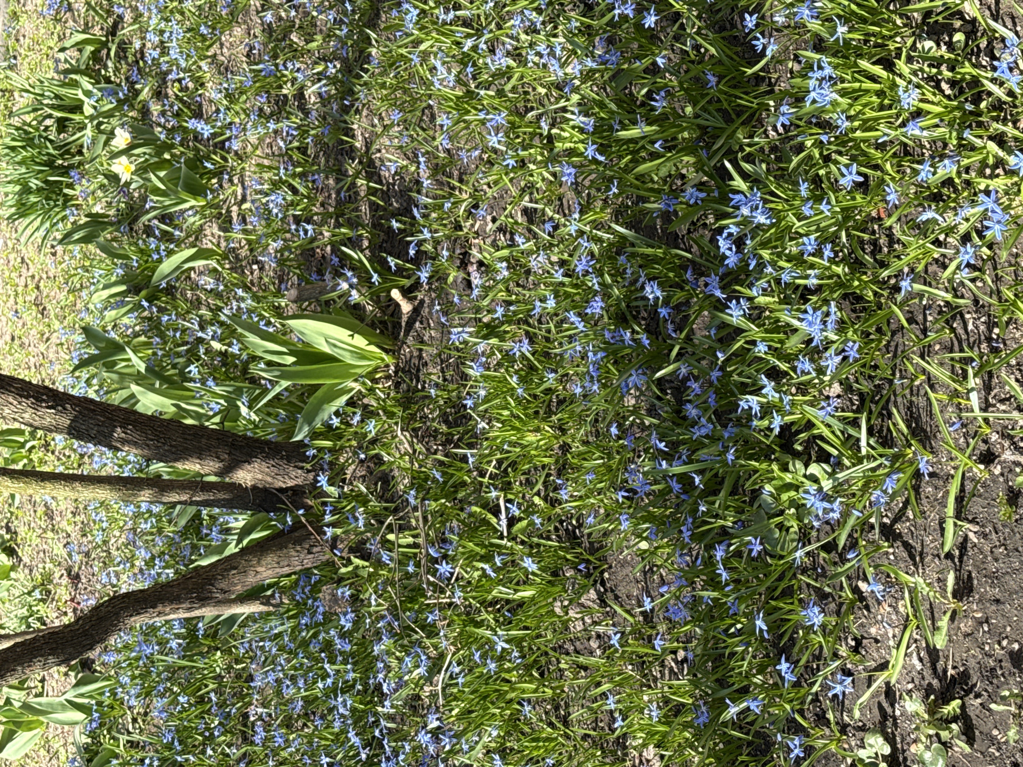 ground-level view of an area with a tree trunk and a dense patch of small blue flowers and green vegetation