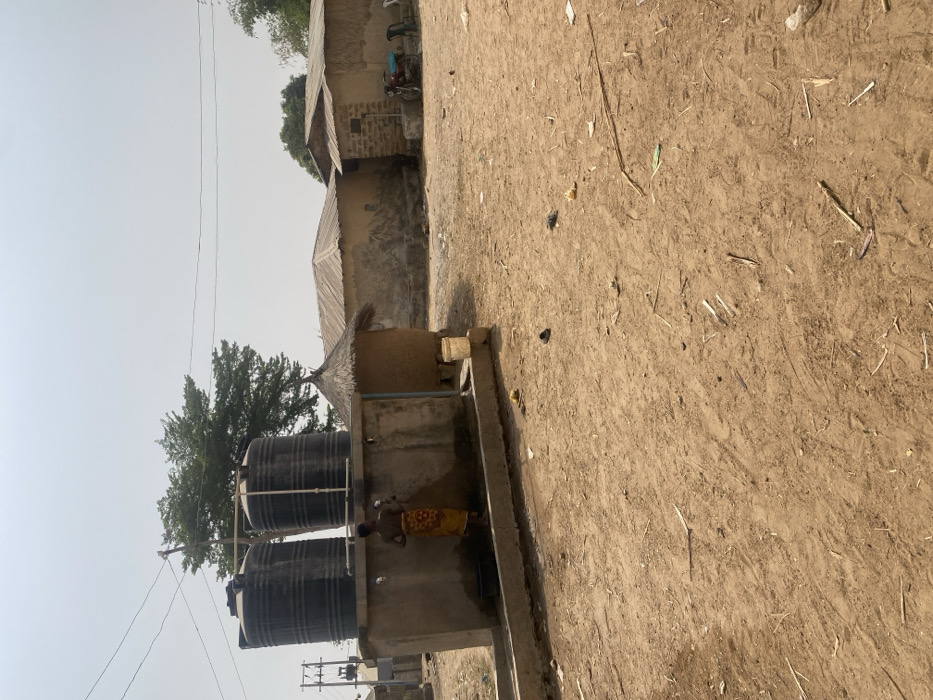 The image depicts an outdoor scene in Katcha, Nigeria, characterized by a dry, dusty, reddish-brown unpaved ground under a hazy sky