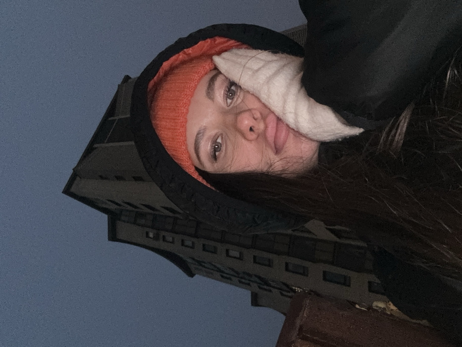 A low-angle close-up photograph captures a young adult female outdoors in Odintsovo, Russia, under dim, likely twilight or nighttime conditions. The subject, positioned in the lower right and center of the frame, wears a dark hooded jacket with the hood raised, partially obscuring her long, dark hair. An orange knitted beanie is visible beneath the hood. Her left hand, covered by a light-colored glove or mitten, rests against her left cheek, while her lips are pursed in a slight pout. Her eyes are open and directed towards the camera. In the background, a tall, multi-story building with a distinctive curved or angled facade and numerous rectangular windows rises against a dark blue-grey sky. The building appears dark due to the ambient light conditions.