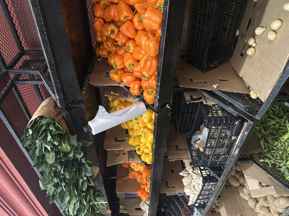 A produce stand with orange bell peppers on the top shelf, followed by yellow ones on the shelf below. Bunches of greens hang from the left side, and other shelves hold produce such as potatoes, onions, and green beans. Plastic bags are available for shoppers. Black metal racks and cardboard boxes create makeshift shelves.