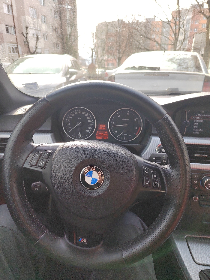 - "The image depicts an interior view from the driver's seat of a BMW vehicle, specifically focusing on the steering wheel and instrument cluster, while looking out through the windshield onto a street scene in Blagoevgrad, Bulgaria" by FM-K4QTZ2, licensed under CC BY 4.0