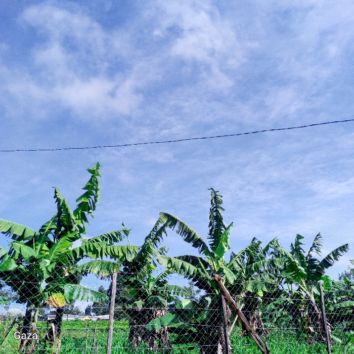 The image depicts an outdoor agricultural or rural scene in Bonyamaro ward, Kenya, characterized by tropical vegetation under a partly cloudy sky. The top approximately 60% of the frame shows a light blue sky with scattered, thin white clouds. A single, thin, dark horizontal line, consistent with an overhead power or communication cable, traverses the sky horizontally above the mid-point of the frame. In the lower portion of the image, a chain-link fence runs horizontally across the foreground, supported by wooden posts. One such post, braced diagonally, is visible towards the right-center. Immediately behind the fence, numerous green banana plants with large, elongated leaves are the dominant vegetation. The leaves exhibit varying conditions, with some appearing intact and others showing signs of wear or tearing along their edges. Green grass and low-lying vegetation are visible at the base of the fence and banana plants. No individuals or animals are present. The scene is brightly illuminated by daylight.