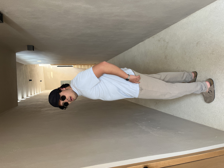 - "A man stands in a hallway, wearing a white t-shirt, beige pants, and beige sandals" by FM-u1XXD2, licensed under CC BY 4.0