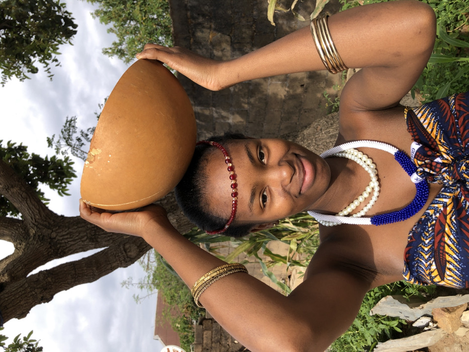 A smiling woman is centered in the image, wearing traditional attire, including a beaded headband, necklaces, and bracelets. She holds a large, halved gourd above her head. The background includes a tree on the left and greenery on the right, suggesting an outdoor setting. The sky is overcast. The woman's colorful patterned top is tied at her shoulder.