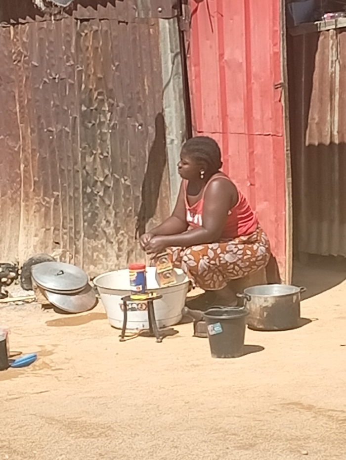 - "An outdoor scene in what is described as Jos, Nigeria, depicts an adult female crouched on what appears to be a low stool or block" by FM-htc8X2, licensed under CC BY 4.0
