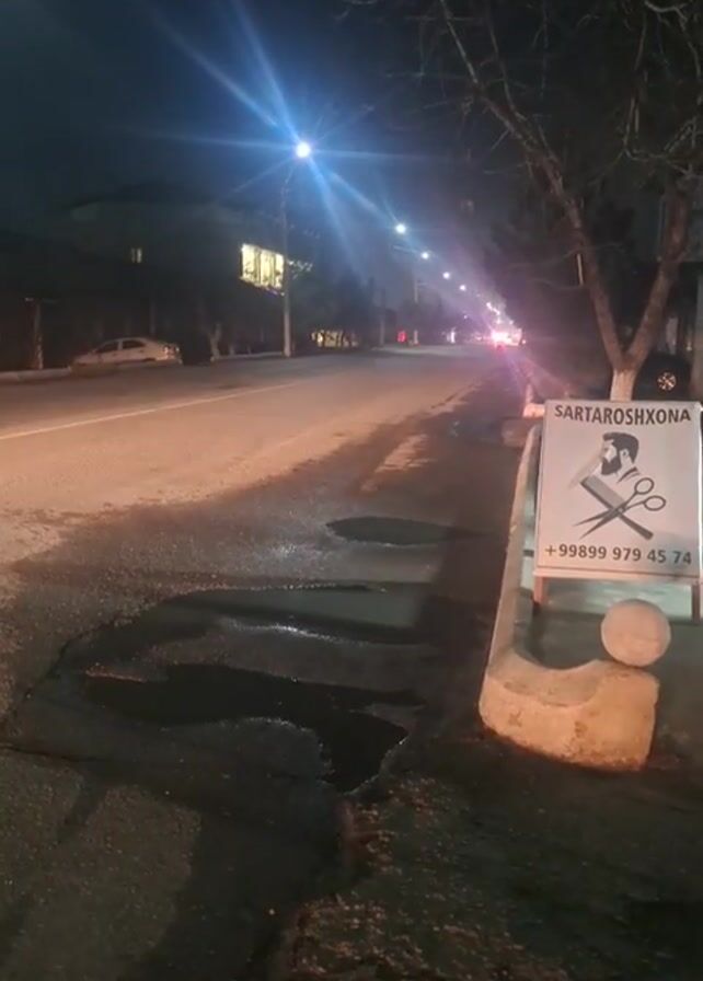 night scene on a street with streetlights illuminating the roadway. The pavement is cracked and has puddles of water. On the right side of the road, there's a small sign that says "SARTAROSHKHONA" with a phone number and an image of barber tools. Cars pass by on the road, heading away from the camera. Trees line the sidewalk. The sky is dark and clear.