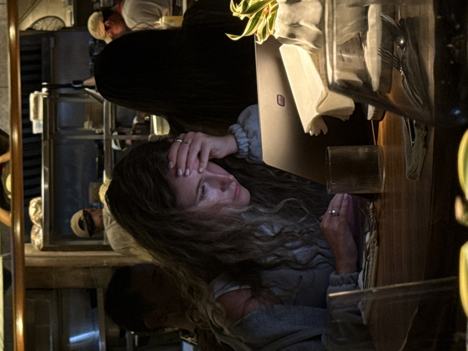 The image depicts an interior scene within a restaurant or cafe in Tibubeneng, Indonesia. A woman with long, wavy, light brown hair, wearing a grey long-sleeved top, is seated at a dark wooden table in the foreground. She is leaning forward, intently focused on an open silver laptop, which illuminates her face. Her left hand rests on the laptop's keyboard/touchpad area, and her right hand supports her head, with fingers spread across her forehead. She wears a ring on her left ring finger and another on her right ring finger. A small, light-colored sticker is visible on the upper right corner of the laptop's lid. To the right of the laptop, a ribbed clear glass tumbler is present, alongside a stack of white folded paper napkins. Further right, a small decorative plant with green and yellow variegated leaves is housed in a light-colored, textured pot. Out-of-focus clear glasses, one containing cutlery, are visible in the immediate foreground. In the midground, three other individuals are partially visible: two dark silhouettes of seated individuals to the left and directly behind the main woman, and one person with long dark hair, seen from behind, seated to her right. The background reveals a kitchen area with metallic shelving stacked with various items. Two male individuals, wearing light-colored tops and baseball caps, are standing and working within this kitchen area. Overhead lighting illuminates the kitchen, contrasting with the dimmer ambient light of the seating area.