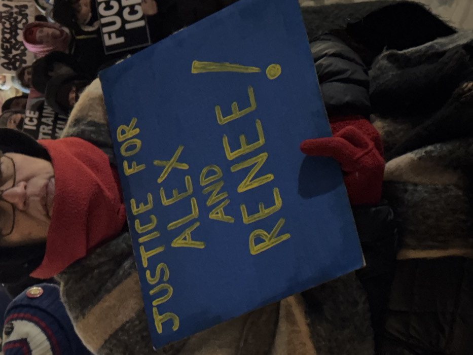 A person is holding a blue sign at a protest. The sign reads "JUSTICE FOR ALEX AND RENEE!" in yellow lettering. The individual is wearing a red scarf and red gloves. Other people can be seen in the background, some holding signs that say "F*CK ICE" and "AMERICAN RACISM=FASCISM." The person holding the sign is standing among a crowd of other protesters.