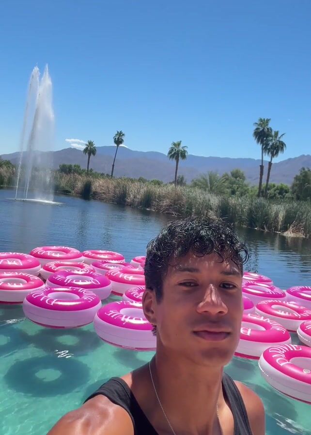 A young man stands in front of a lake filled with pink inflatable donuts on a sunny day. The man is wearing a black tank top and a silver necklace. He looks directly at the camera. Behind him, the lake has a fountain, with palm trees and mountains in the distance. The sky is clear and blue.